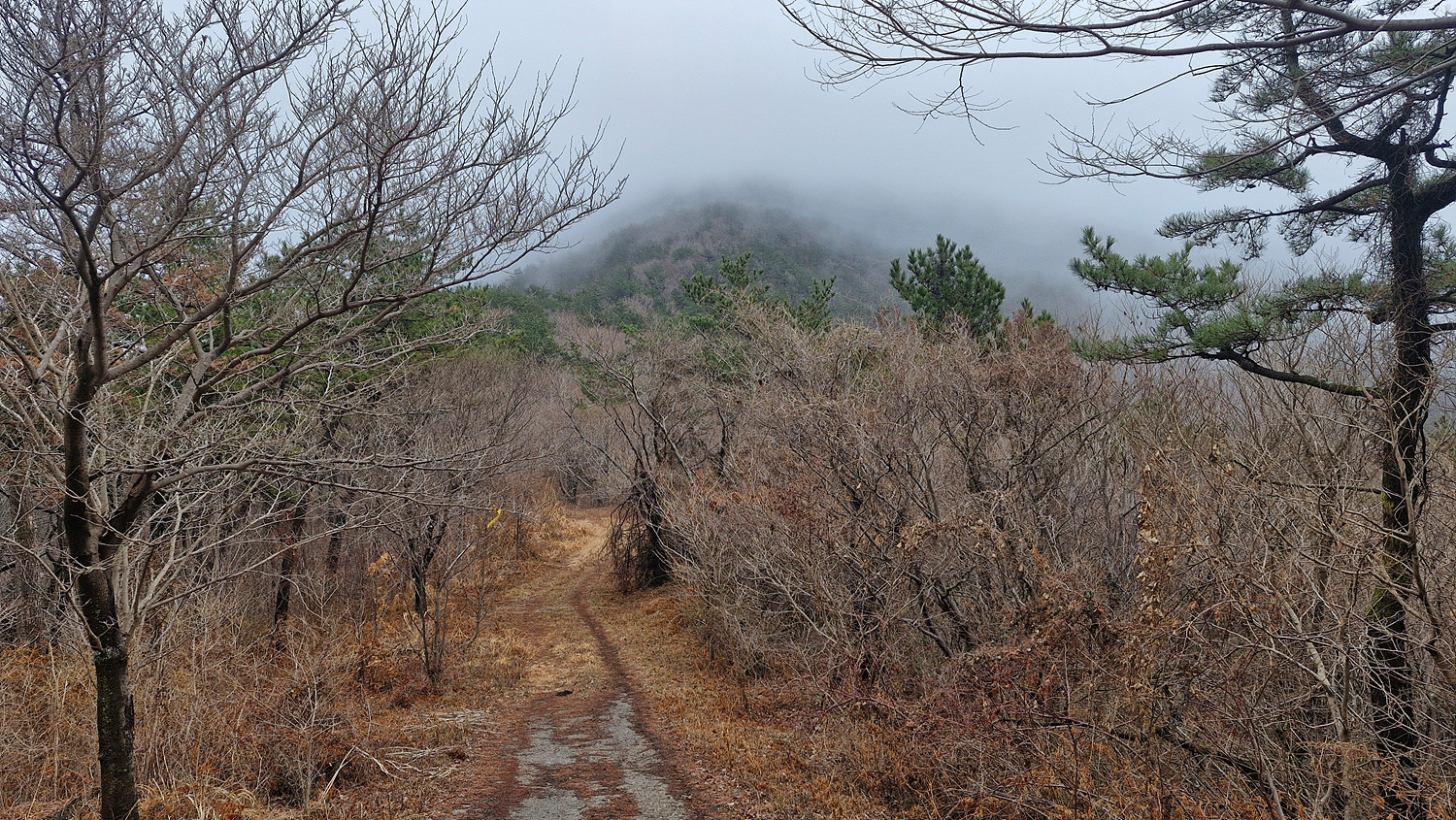 다시 임도에 내려서니 봉황산이 안개속에 묻혀있다.