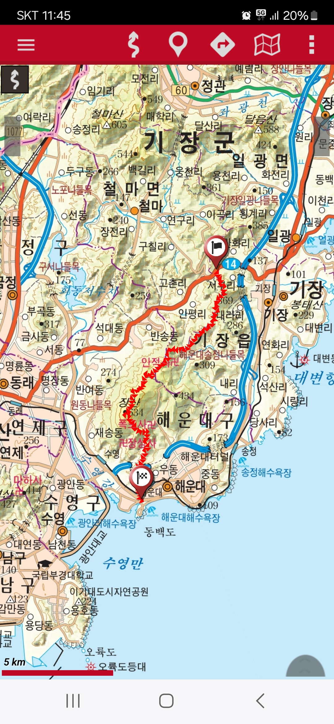 진행방향으로 장산은 5km라고 안내한다.