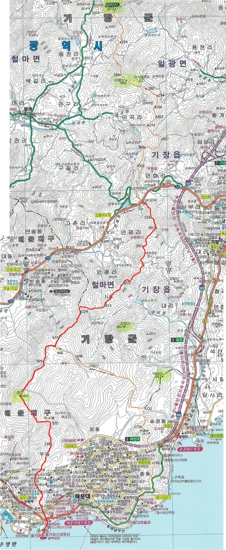 516봉=>장산(634m)=>중봉(381m)=>옥녀봉(370m)=>